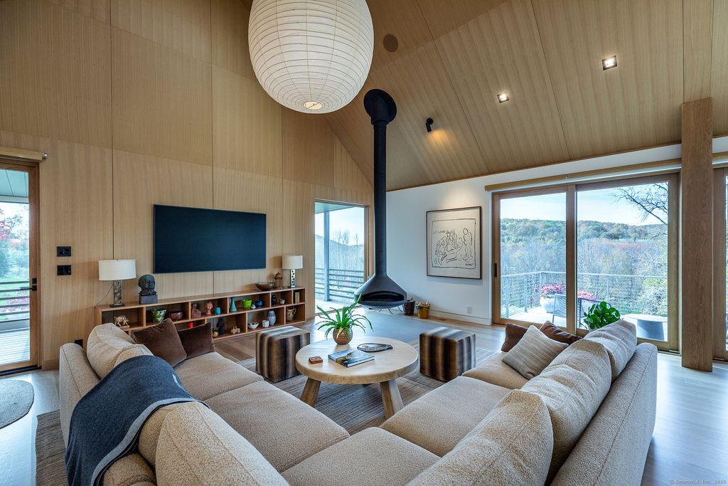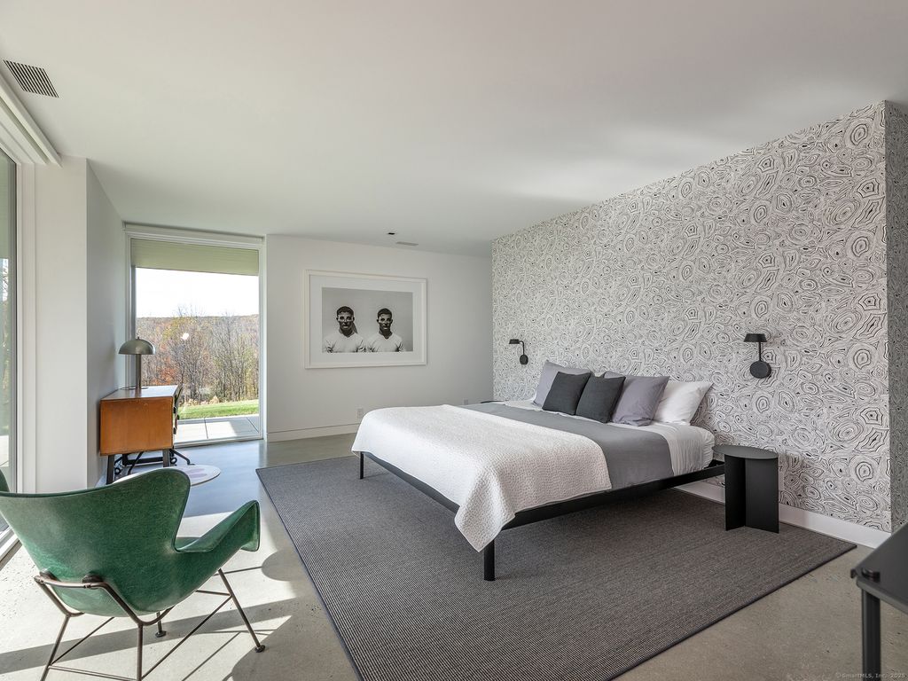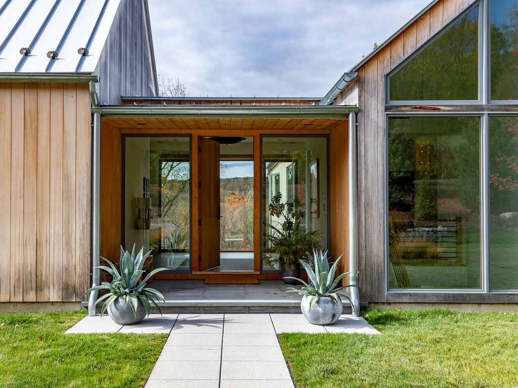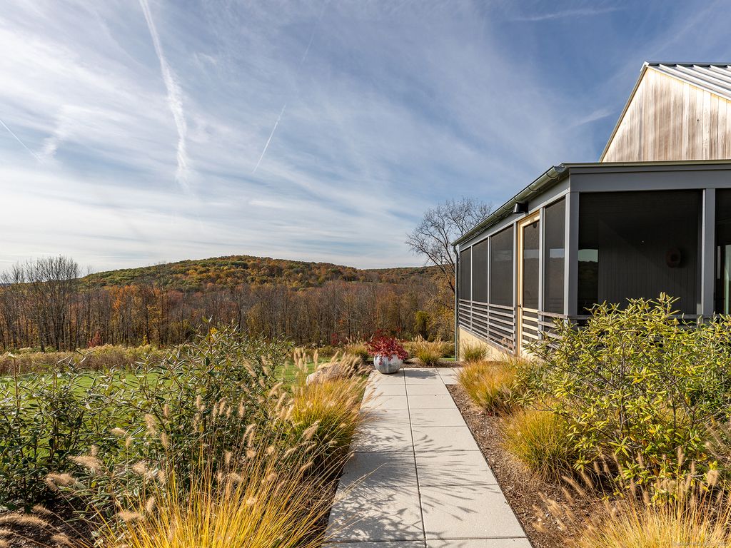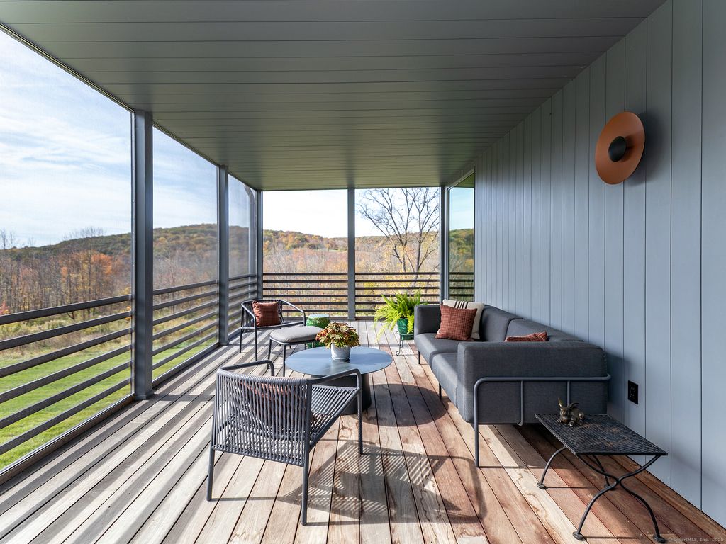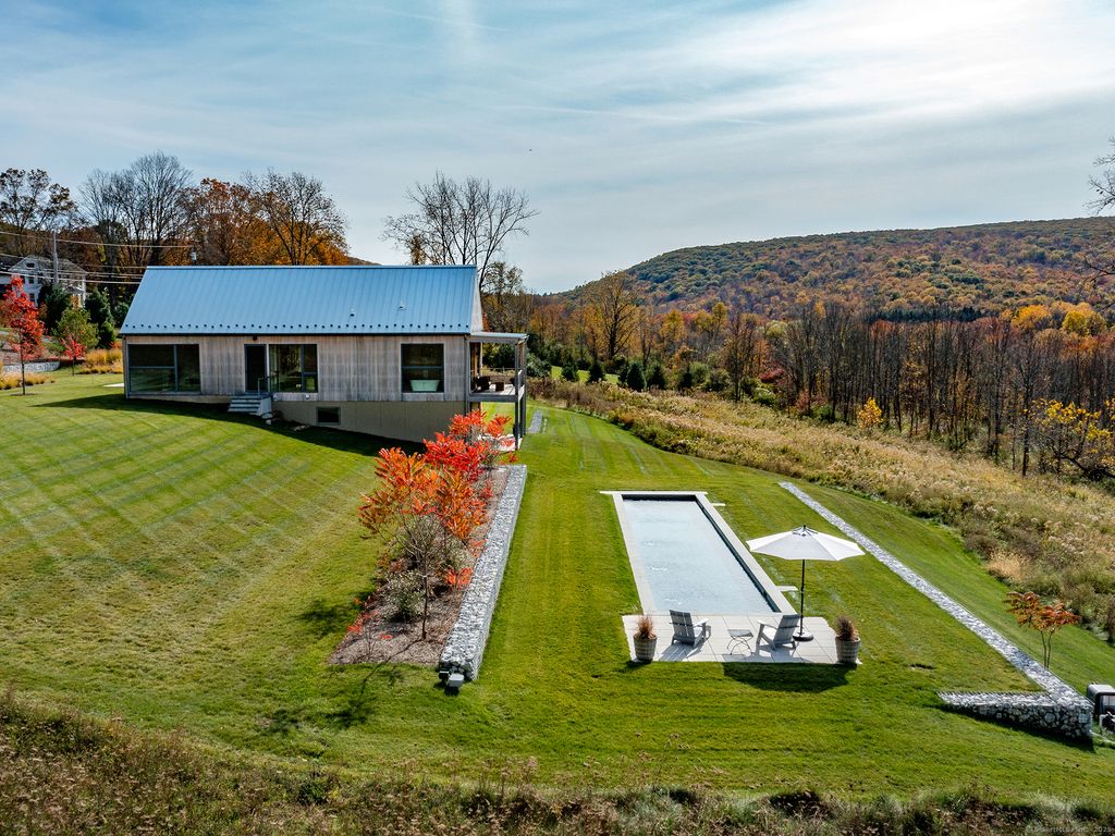 Escape to your sunlight-filled, modern architectural retreat on a winding country road in Merryall, just minutes from Lake Waramaug Country Club, Bulls Bridge Golf Club, and the uber-chic villages of New Preston, Washington and Kent. Using the American barn as his inspiration, a well-known designer custom built this Litchfield County home for his own use. The house is sited in a large open field, perfectly situated to offer panoramic rolling hill views from every room – stunning in all seasons. The open-concept main floor features spacious living areas, an oak paneled Great Room with soaring ceilings, a screened porch for outdoor enjoyment, a primary bedroom suite, office, and flexible room -ideal as a second bedroom, den, or gym. The lower level includes a media/game room, second bedroom and bath, large laundry room, plus ample unfinished space if expansion is desired. Every aspect of this home, from its architecture to the landscape design to its curated furnishings is crafted for both visual impact and relaxed, comfortable living. The 60-foot Gunite heated pool is spectacular. Luxury finishes like radiant heated floors, standing seam metal roof, custom cabinetry and built ins, oak and birch paneling, high-end appliances, oversized 2 car garage, discrete solar array and multiple terraces complete the package. Absolutely mint condition. Recently featured in Dwell magazine and CT Cottages & Gardens.